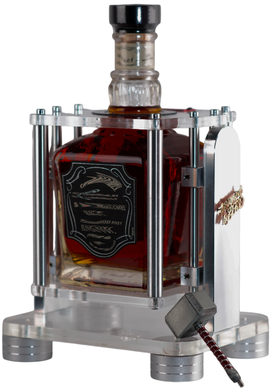Was meinen Ständer wirklich einzigartig macht, sind die verschiebbaren Elemente und die verstellbaren Verbindungsstangen, die es ermöglichen, ihn an verschiedene Flaschen anzupassen. Egal ob Whisky, Cognac, Rum, Gin oder ein anderes Getränk – mein Ständer ist für sie alle gemacht. Durch die Neodym-Magnete wird der Rücklauf der Flasche sanft gebremst, während die gummierten Füße für einen sicheren Stand sorgen. Und für den Flaschenwechsel? Nun, dafür habe ich einen besonderen „Hammer“ entwickelt. Mit ihm lässt sich die leere Flasche im Handumdrehen austauschen. Der Austausch gilt nur für eine Flasche gleicher Sorte, denn wenn die Flaschen unterschiedlich breit sind, dann passen Sie nicht auf das vorhandene Acrylglas. Dieses wird für jede Flaschenart neu angefertigt.